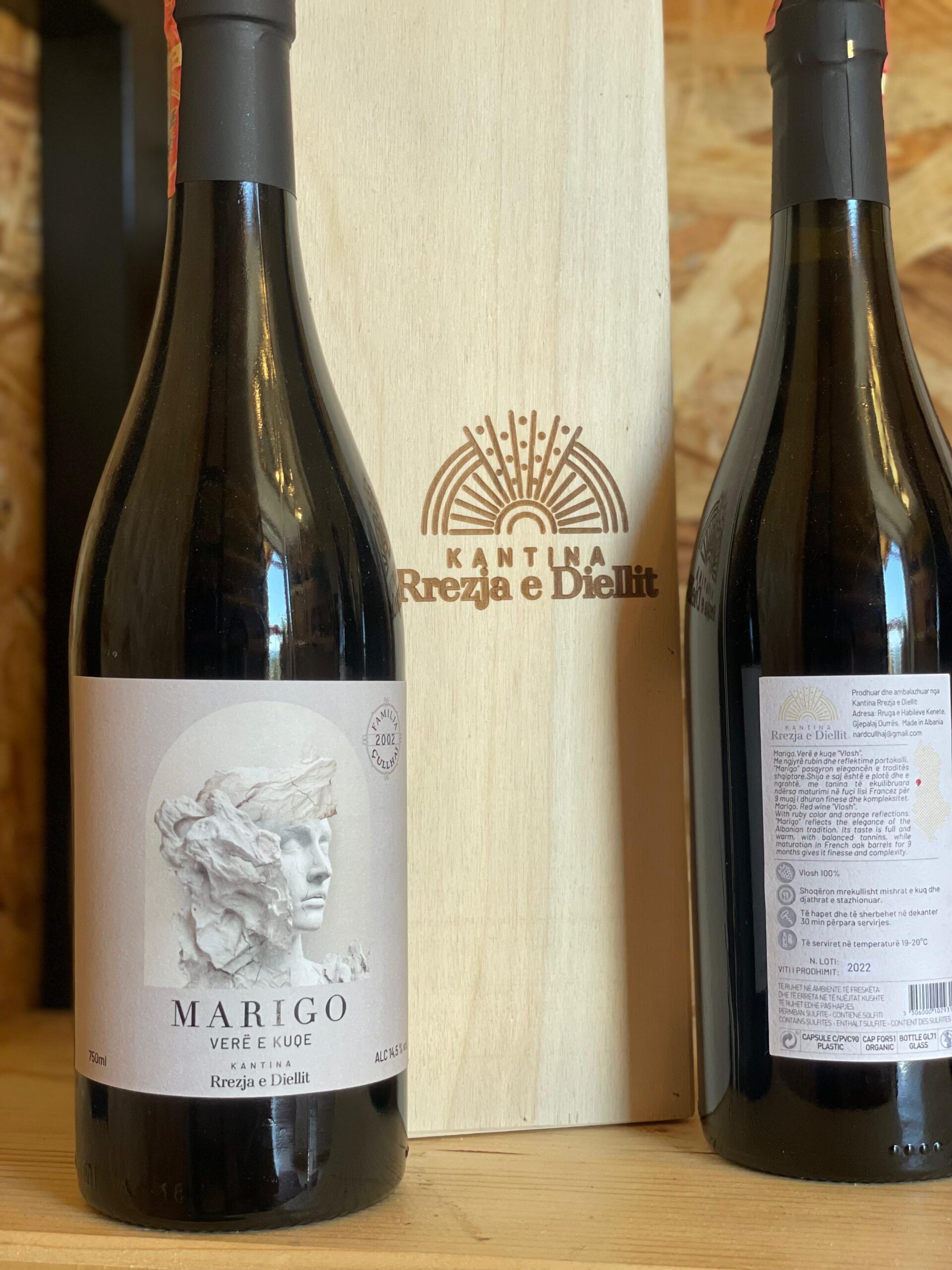 MARIGO është vera që përfaqëson më së miri karakterin dhe identitetin e Kantinës Rrezja e Diellit. E prodhuar nga rrushi autokton Vlosh, kjo verë lind nga vreshta të punuara me kujdes dhe nga një proces vinifikimi i ndërtuar mbi durimin dhe respektin për natyrën. Fermentimi dhe pjekja zhvillohen në kushte të kontrolluara, duke i dhënë verës strukturë të plotë, harmoni dhe thellësi. Aroma të ngrohta frutash të pjekura ndërthuren me nota të lehta druri, ndërsa shija është e qëndrueshme, elegante dhe e balancuar. MARIGO është një verë që shijohet ngadalë, e menduar për momente të veçanta dhe për ata që kërkojnë një eksperiencë autentike shqiptare në çdo gotë.